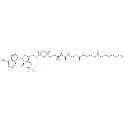 S(CCCCC)CC(SCCNC(=O)CCNC(=O)[C@H](O)C(C)(C)COP(=O)([O-])OP(=O)([O-])OC[C@H]1O[C@@H](N2C=Nc3c(N)ncnc23)[C@H](O)[C@@H]1OP(=O)([O-])[O-])=O