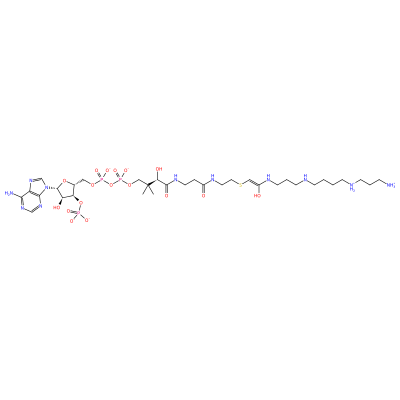S(CCNC(=O)CCNC(=O)[C@H](O)C(C)(C)COP(=O)([O-])OP(=O)([O-])OC[C@H]1O[C@@H](N2C=Nc3c(N)ncnc23)[C@H](O)[C@@H]1OP(=O)([O-])[O-])/C=C(\O)/NCCCNCCCC[NH2+]CCC[NH3+]
