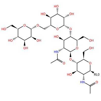 OC[C@H]1O[C@H]([C@H](NC(=O)C)[C@@H](O)[C@@H]1O[C@@H]2O[C@H](CO)[C@@H](O[C@@H]3O[C@H](CO[C@H]4O[C@H](CO)[C@@H](O)[C@H](O)[C@@H]4O)[C@@H](O)[C@H](O)[C@@H]3O)[C@H](O)[C@H]2NC(=O)C)[?RL0?]