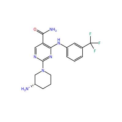 FC(F)(F)c1cccc(Nc2nc(ncc2C(=O)N)N3CCC[C@H]([NH3+])C3)c1
